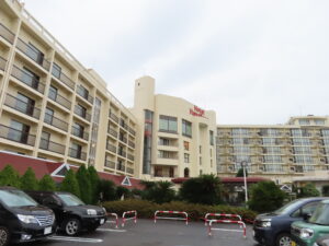 ホテルハワイアンズのフロント横のカウンターで手続後、駐車場へ向かいます。