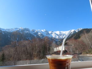 帰りに第二ロープウェイの山麓駅のベーカリーカフェで笠ヶ岳を見ながらお茶してきました