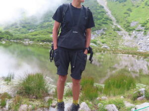 ups+downsのトレッキングTeeに前掛けタイプバック「タロキンバック」を着用。