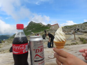 頂上山荘までも近いので、フライングしてソフトクリームとビールで打上げ。